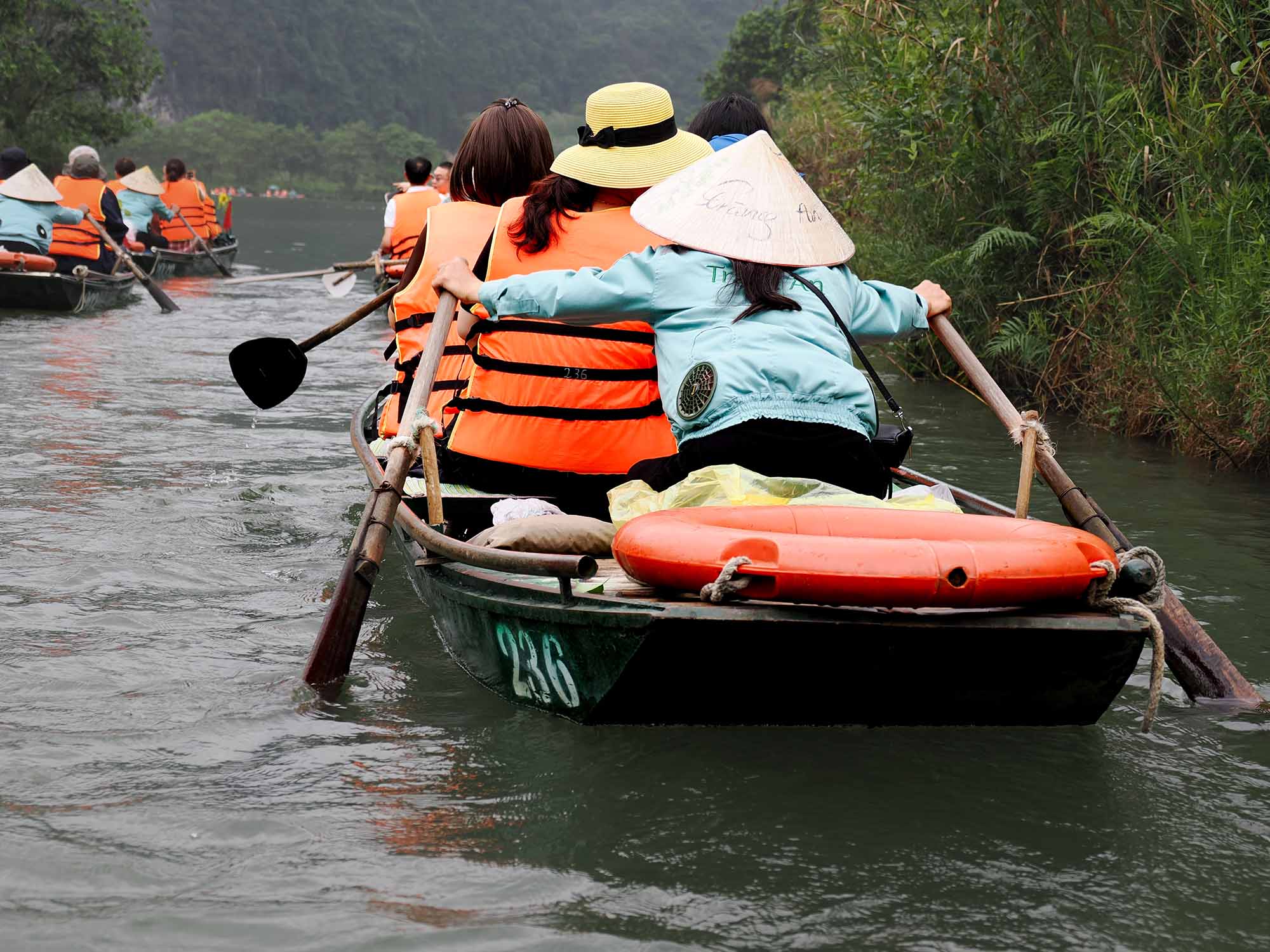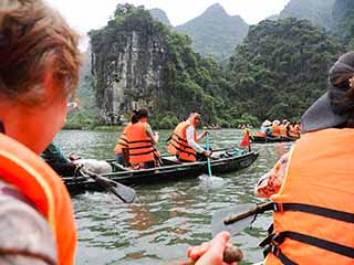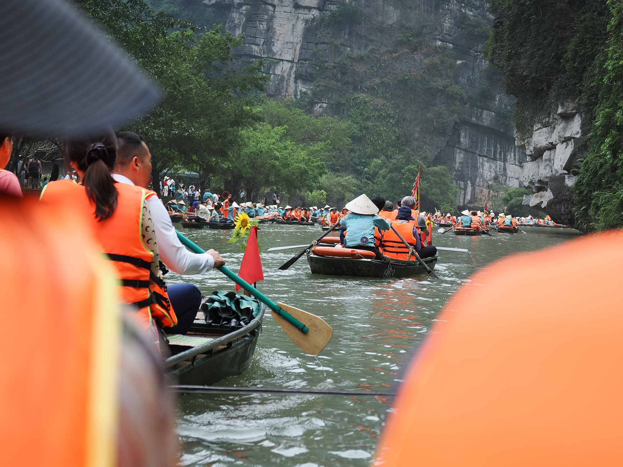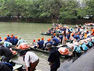 ハノイについた翌日 2時間以上バスで移動して ニンビン省チャンアンへ行きました 目的は手漕ぎボートによるクルーズです 船着場には沢山のボートが並んでいました 平底舟で安定が悪く 慎重に乗り込みます |