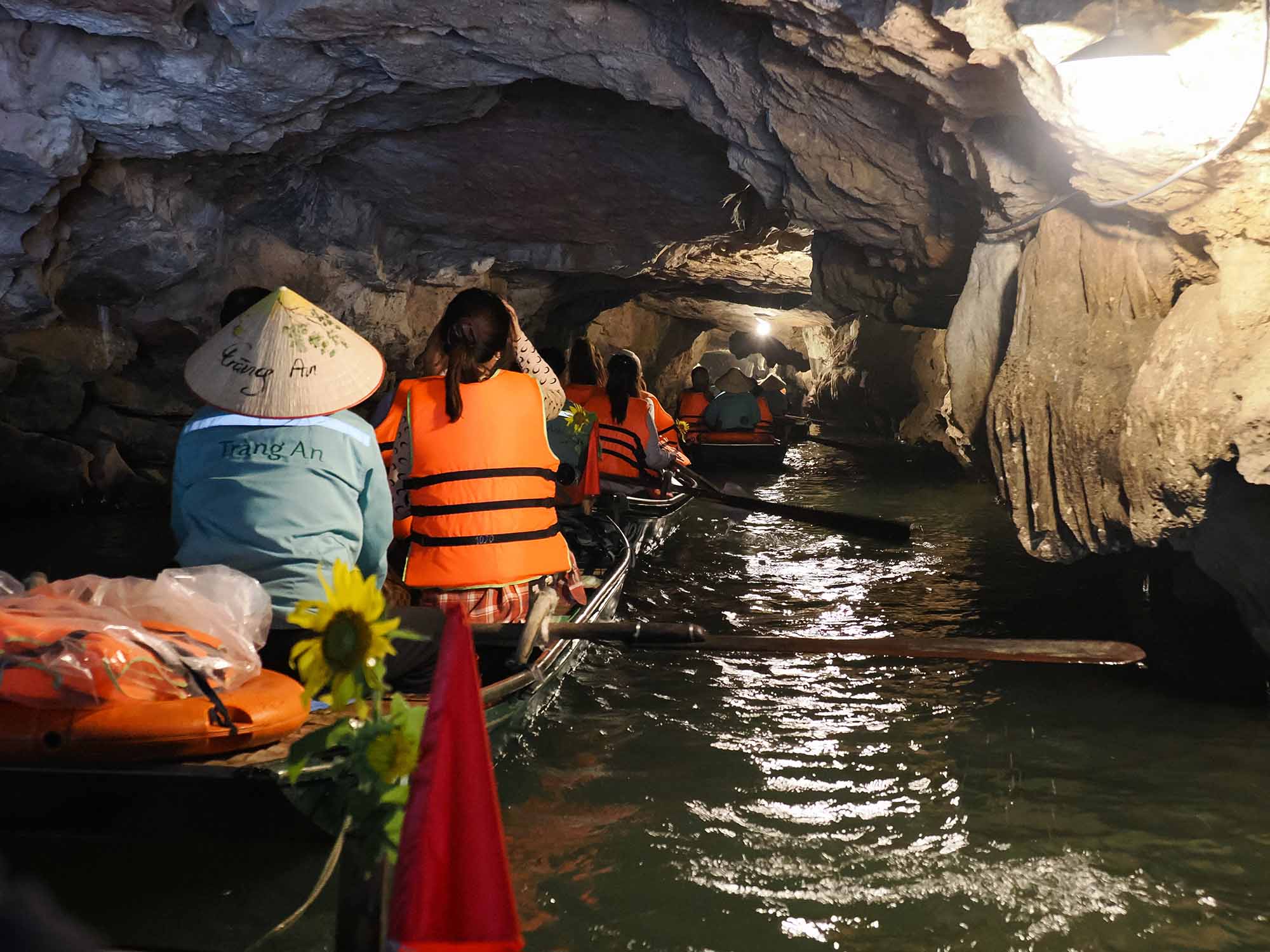 周りは奇岩だらけで桂林に例えられます 石灰岩質ですね ボートには観光客用のオールも用意されています 最初は漕ぐのですが 疲れてやめてしまいます 結果として漕ぎ手の負担は軽減されません(^。^;) |